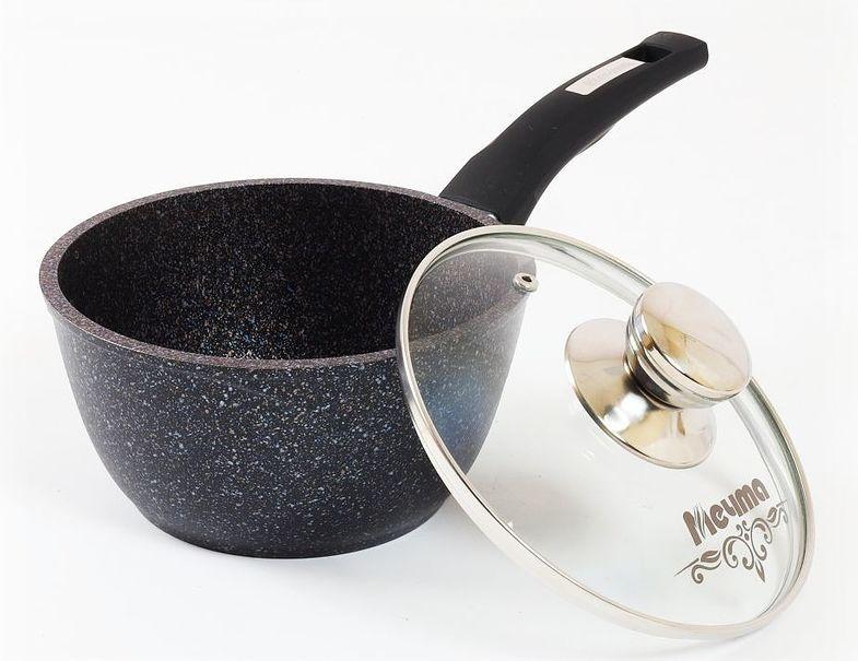 Ковш 1.7л c антипригарным покрытием, несъемной ручкой и стеклянной крышкой серии "Гранит star". Подходит для всех типов плит, кроме индукционных. Можно использовать в посудомоечной машине.
