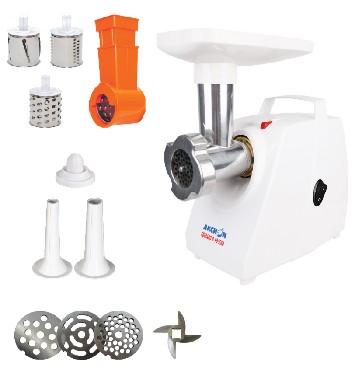 Электрическая мясорубка M34.03 Мощность1500 Вт Производительность1,66 кг/мин Материал Пластик Размеры 0,19 х 0,29 х 0,41 Вес 4,6 кг.решетки с отверстиями диаметром 5 и 7мм и решетка с овальными отверстиями.Нож из нержавеющей стали с саблевидной режущей кромкой,приставка для набивки колбас.Приставка кеббе Приставка овощерезка с 3мя барабанами.Электрическая мясорубка М34.03 повышенной мощности без труда справится с мясом любого качества. Предназначена для приготовления фарша из мяса, рыбы, грибов; измельчения овощей, фруктов; получения пюреобразных масс из ягод; профилирования теста.