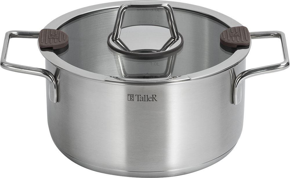 Кастрюля с крышкой "Сascade", 20*10.5 см, 3.0 л Толщина стенки - 0,6мм. Толщина дна 2.9мм. Полировка внешняя - матовая, внутренняя - матовая. Крышка из жаропрочного стекла со стальным ободом с функцией слива жидкости. Стальные ручкина сварке. Есть отметки емкости. Рекомендации: нельзя использовать в духовом шкафу, подходит для всех типов плит (в т.ч. индукционная). Базовая цена 2284 руб.