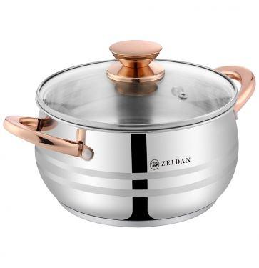 Кастрюля ZEIDAN Z-501071 6,1 л с крышкой, Кастрюля со стеклянной крышкой - 6,1 Л (O24 см), нержавеющая сталь, 3-x СЛОЙНОЕ КАПСУЛИРОВАННОЕ ИНДУКЦИОННОЕ ДНО, крышка - стекло, ручки на корпусе и крышке "ПОД ЗОЛОТО", комбинированная полировка снаружи, матовая полировка внутри. Подарочная упаковка.