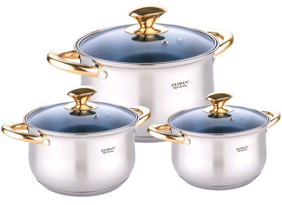 Набор кастрюль, 6 предм. (3 КАСТРЮЛИ С КРЫШКАМИ: 3,0 Л (18 см ), 4,0 Л (20 см ), 6,1 Л (24 см ), нержавеющая сталь, зеркальная полировка снаружи, матовая полировка внутри, шкала литража, ручки на корпусе "ПОД ЗОЛОТО", цветная стеклянная крышка с ручкой "ПОД ЗОЛОТО", 3-x слойное капсулированное индукционное дно. Подарочная упаковка с ручкой.