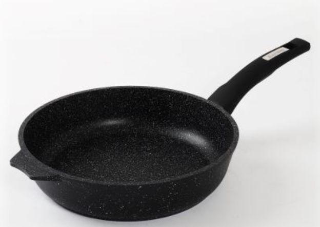 Сковорода 22см с антипригарным покрынием и несъемной ручкой серии "Гранит black". Подходит для всех типов плит, кроме индукционных. Можно использовать в посудомоечной машине.