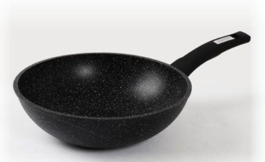 Сковорода ВОК 28см с антипригарным покрытием и несъемной ручкой серии "Гранит black". Подходит для всех типов плит, кроме индукционных. Можно использовать в посудомоечной машине.