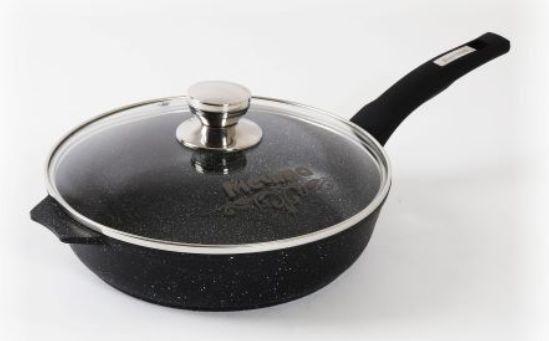 Сковорода 22см с антипригарным покрытием, несъемной ручкой и стеклянной крышкой серии "Гранит black". Подходит для всех типов плит, кроме индукционных. Можно использовать в посудомоечной машине.