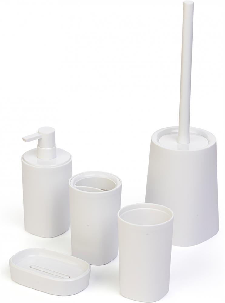 Набор аксессуаров для ванной комнаты "Пьюр" состоит из 5 предметов в который входит: дозатор для жидкого мыла 465 мл, стакан для зубных щеток 480 мл, стакан для зубной пасты 480 мл, мыльница для кускового мыла и ершик для унитаза с контейнером 540 мл. Механический диспенсер подходит для жидкого мыла, моющего средства для посуды, шампуня и кондиционера для волос или геля для душа. Конструкция надежная и экономичная, исключает протекания и перерасход жидкого мыла. Мыльница для кускового мыла подходит под размер большого куска и имеет внутри углубление в виде поддона, чтобы кусок не размокал. Два стакана для зубных щеток и пасты свободно вмещают предметы личной гигиены всей семьи. Ершик для унитаза напольный с подставкой предназначен для поддержания чистоты ванной и туалета. Щетка изготовлена из синтетических материалов. Длина и жесткость ворса позволяют легко удалять загрязнения с поверхности унитаза. Набор аксессуаров для ванной комнаты "Пьюр" выполнен в белом цвете