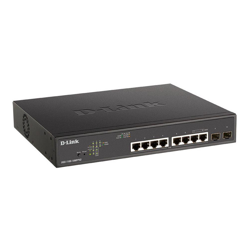 Коммутатор D-Link DGS-1100-10MPPV2/A3A Настраиваемый L2 коммутатор с 8 портами 10/100/1000Base-T и 2 портами 1000Base-X SFP (порты 1–8 PoE 802.3af/at, порты 7–8 PoE 802.3bt, PoE-бюджет 242 Вт)