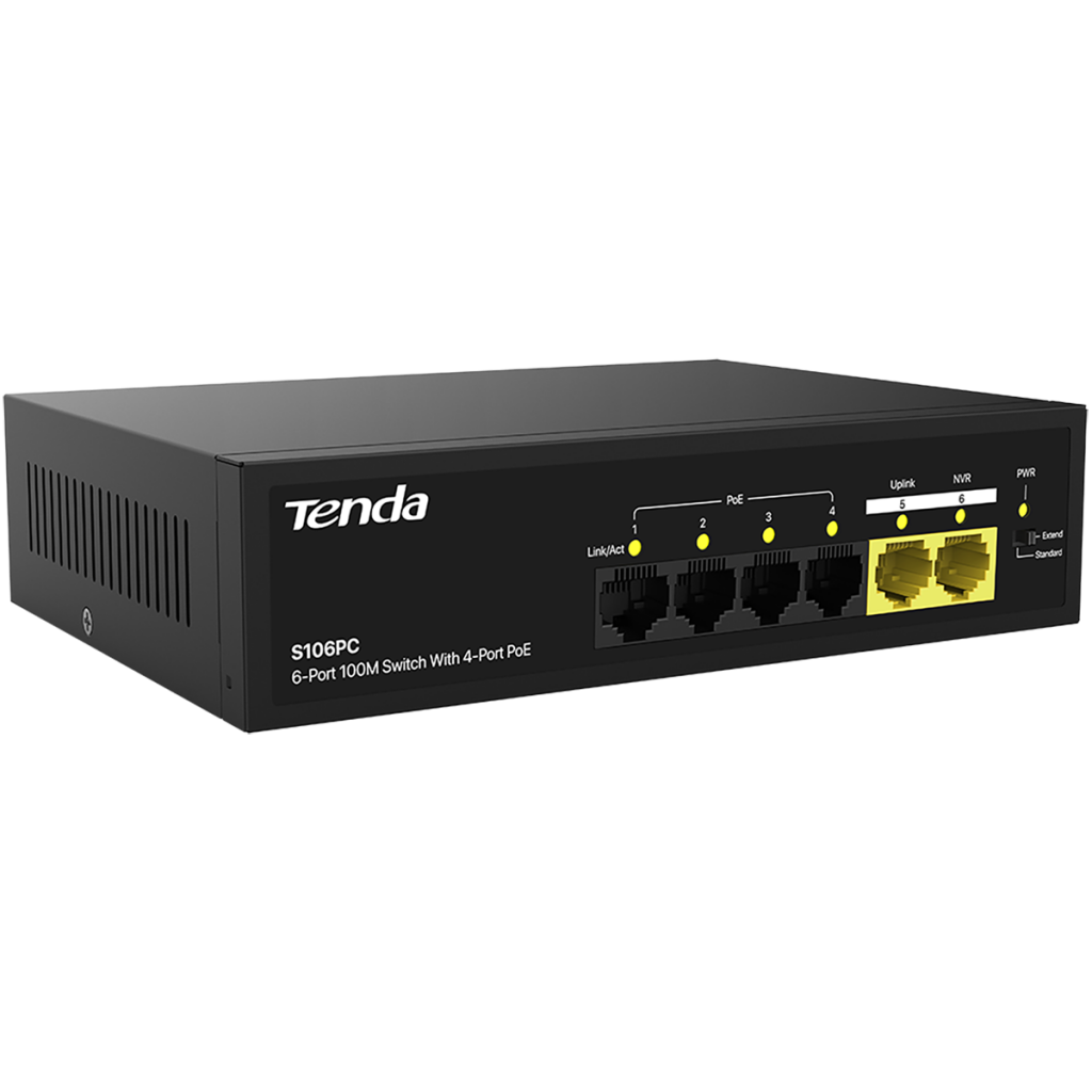 Коммутатор Tenda S106PC Коммутатор неуправляемый PoE, 6 портов 5x100 Мбит/с, PoE 4х до 30 Вт, настольный
