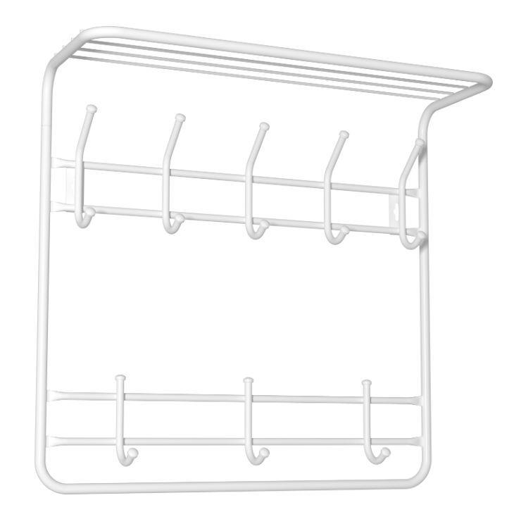 Надежная разборная конструкция. — компактная 2-х ярусная вешалка с 8-ю крючками. — удобная полка для хранения головных уборов. — допустимая нагрузка до 5 кг на крючок. — Удобный пластиковый крючок для мелочей. — Расстояние между крепёжными отверстиями 500 мм. Материал Сталь, полимерное покрытие. Габариты (Д*Ш*В) 60*22*58 см.