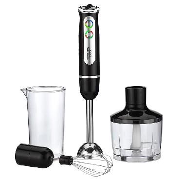 Номинальная потребляемая мощность 800 Вт. Объем чаши мини-измельчителя 860 мл. Объем мерного стакана 600 мл. Индикатор сети с LED-подсветкой кнопок. Нож и насадка из нержавеющей стали с 4 лезвиями. Плавная регулировка скорости. Режим ТУРБО. Три сменных насадки. Насадка для измельчения и перемешивания. Венчик с держателем. Мини-измельчитель с крышкой. Мерный стакан. Противоскользящие ножки чаши мини-измельчителя. Низкий уровень шума. Цвет: черный.