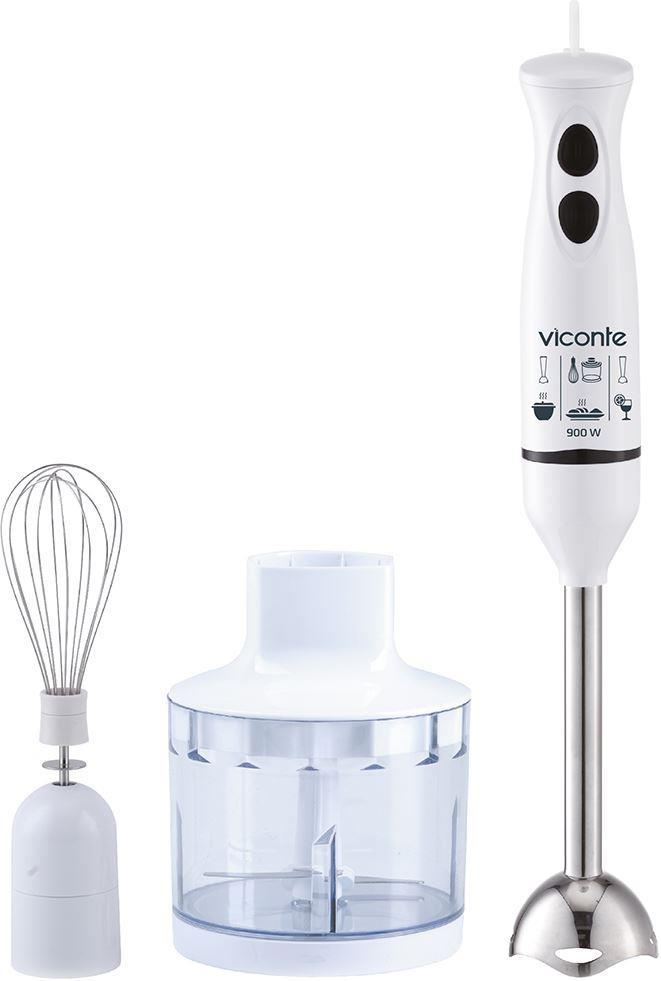Погружной блендер Viconte VC-4449 900 W, Погружной блендер, мощность 900 W, современный эргономичный дизайн, пульсовый режим работы, 2 скорости, лезвия из нержавеющей стали, металлическая нога блендера, венчик для взбивания, чаша с ножом для рубки и измельчения, 500 мл; автоматическая блокировка при неправильно установленной насадке, удобство и простота в обращении и чистке.