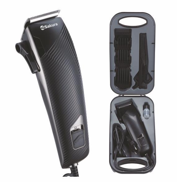 Кейс для переноски и хранения, стальное лезвие, работа от сети 220-240 В, мощный мотор (7 Вт), 3-ступенчатая регулировка лезвия с помощью рычажка, кабель питания 1,8 м, в комплекте: 4 насадки (3, 6, 9 и 12 мм), расческа, ножницы, масло, кисточка для очистки. Цвет: чёрный/ хром