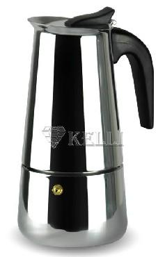 На 4 чашки. Нерж. сталь. Ручка и кнопка из нейлона (не нагреваются). Предохранительный клапан давления. Можно использ-ть на газ. плитах.Гейзер состоит из нижней емкости для воды, спец. сита-фильтра для кофе и верхнего чайничка для уже готового напитка.