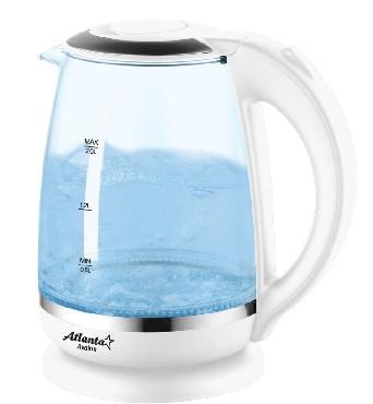 ATLANTA ATH-2471 (WHITE) Чайник стеклянный электрический Объем 2.0 литра Корпус из термостойкого стекла Иллюминация Специальная ручка от скольжения Поворот на подставке на 360° Быстрое закипание Фильтр от накипи Закрытый нагревательный элемент Автоматическое отключение Защита от перегрева без воды Электрошнур в цокольной подставке. 67см Номинальная мощность 1850-2200 Вт 220-240 B ~ 50/60 Гц