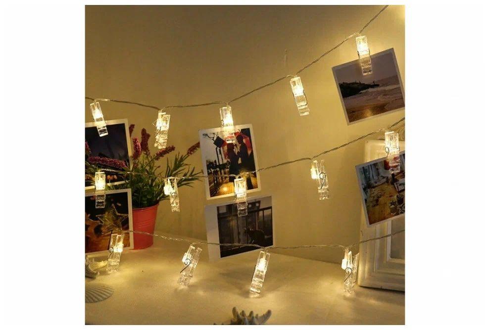 Гирлянда со светодиодами-прищепками для фотографий, 20 шт Работает от батареек АА. Цвет светодиодов — теплый белый