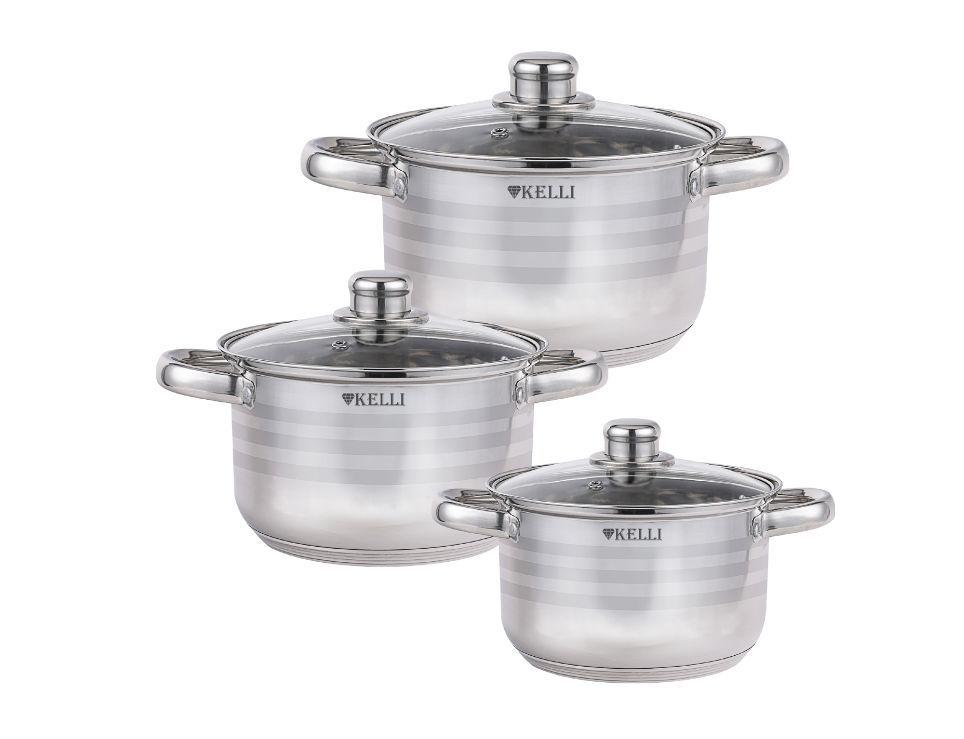 Набор посуды из 6 предметов * Кастрюля со стеклянной крышкой 2 л. Диаметр: 16 см * Кастрюля со стеклянной крышкой 2,5 л. Диаметр: 18 см * Кастрюля со стеклянной крышкой 3,5 л. Диаметр: 20 см * Удобные клепаные ручки не нагреваются * Крышки с паровыпуском * 5-ти слойное капсульное дно * Пригодна для всех видов плит *