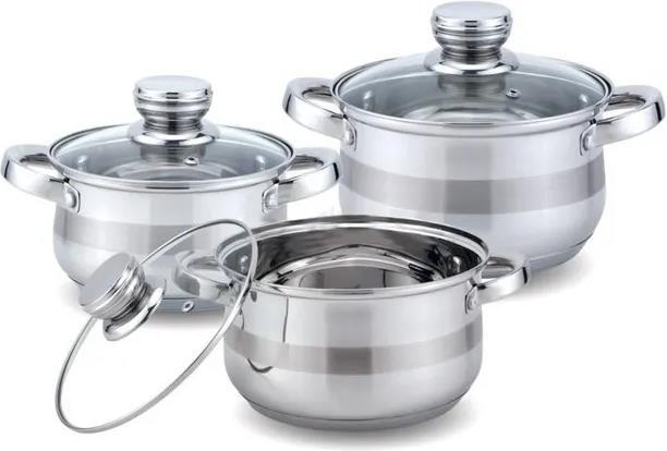 Набор посуды из 6 предметов Кастрюля с крышкой 2,1 л Диаметр: 16 см Кастрюля с крышкой 3,0 л Диаметр: 18 см Кастрюля с крышкой 4,0 л Диаметр: 20 см Внутри кастрюль шкала измерения Высококачественная нержавеющая сталь 18/10. 5-слойное капсульное дно. Зеркальная поверхность. Матовая полоска. Можно использовать на всех типах плит включая индукционную. Стеклянные крышки с паровыпуском. Удобные клепаные ручки не нагреваются. Посуда пригодна для мытья в посудомоечной машине.