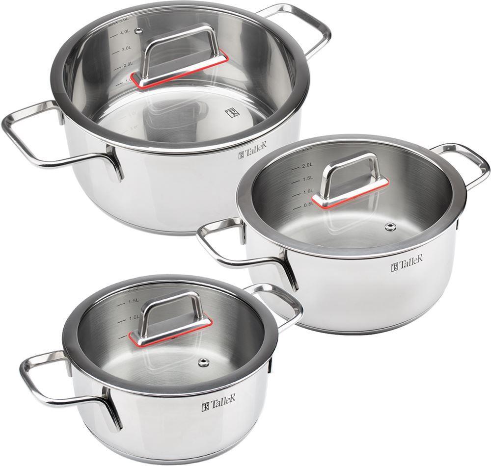 Набор посуды Tendency Состав набора: кастрюля с крышкой 2 л, кастрюля с крышкой 2,8 л, кастрюля с крышкой 5 л. Материал - нержавеющая сталь. Толщина стенки 0,6 мм, толщина дна 2,8 мм Подходит для всех типов плит, в т.ч. индукционной. Можно мыть в посудомо