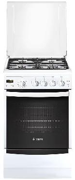 Габариты 50х58,5х85 Цвет белый. Духовка 52л газовая. Газ-контроль духовки и горелок стола, Электроподжиг горелок стола и духовки, Гриль, Таймер, Вертел, Подсветка, Терморегулятор