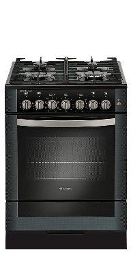 (ВхШхГ)85х60х60см. 4 газ. горелки. Духовка электрическая, 52л. Электророзжиг горелок стола, кнопка на панели. Конвекция. Таймер электромеханический. Электрогриль. Турбо-гриль. Вертел с электроприводом. Фасад стеклянный черный с растровым рисунком.