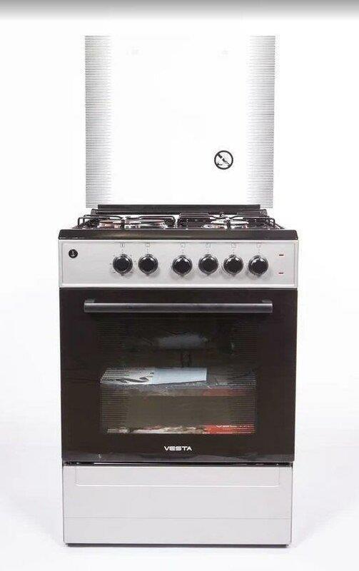 Габариты: Высота 85 см, Глубина 60 см, Ширина 50 см. Цвет сeрый. Тип варочной поверхности комбинированная. Тип управления механическое. Переключатели поворотные. Варочная панель; Общее количество конфорок 4. Число электрических конфорок 1, Число газовых конфорок 3. Характеристики конфорок: Конфорки газовая, электрическая. Материал рабочей поверхности эмалированная сталь. Тип духовки электрическая. объем духовки 55 л, 3 режима духовки: Верхний нагрев, верхний+ нижний нагрев, нижний нагрев, мощность духовки: верхний ТЭН 1000 Вт, нижний 900 Вт. Есть стальные решетки, задняя крышка, материал задней крышки стекло, подсветка духовки.