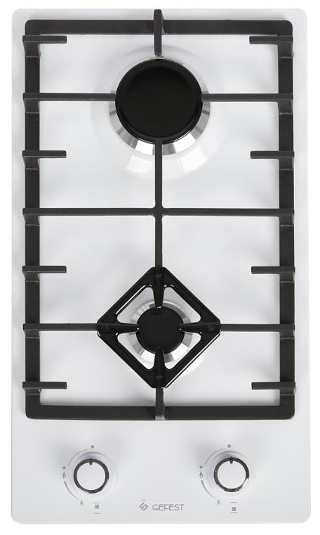Габаритные размеры ШхГхВ: 30х53х9,5 см. Цвет: белый. Двухгорелочный стол. Газ-контроль горелок стола, чугунные решетки горелок стола, большая и малая горелка, фиксированное положение «малое пламя», электророзжиг горелок, встроенный в ручки.