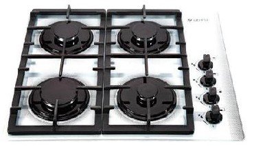 (ВхШхГ) 10х60х52,5см. 4 конфорки. Встроенный электророзжиг. Фиксированное положение «малое пламя». Система «газ-контроль». Варочная поверхность: стеклянная пластина белого цвета, чугунные решетки стола.