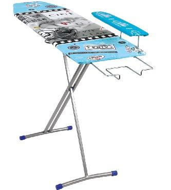 Гладильная поверхность -фанера (1225х345мм), два положения высоты h-70см, h-80см, выдвижная подставка под утюг, съемный подрукавник, электросоединитель 2,2 м, розетка, материал чехла-хлопок, max нагрузка на глад.поверхность 15кг