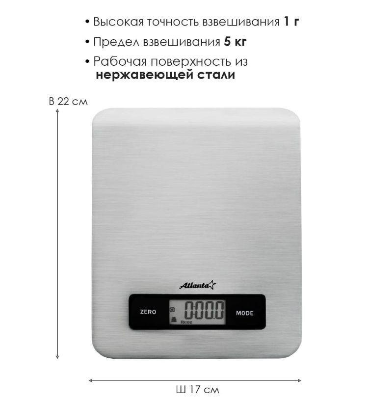 ATLANTAATH-6196 (SILVER) Cтальная рабочая поверхность, максимальный вес 5 кг с шагом 1 г, LED-дисплей. ПОЛНОСТЬЮ ЭЛЕКТРОННЫЙ Полностью электронный принцип взвешивания на высокоточных сенсорах гарантирует точность измерения веса, а благодаря отсутствию механических механизмов, весы прослужат многие годы.