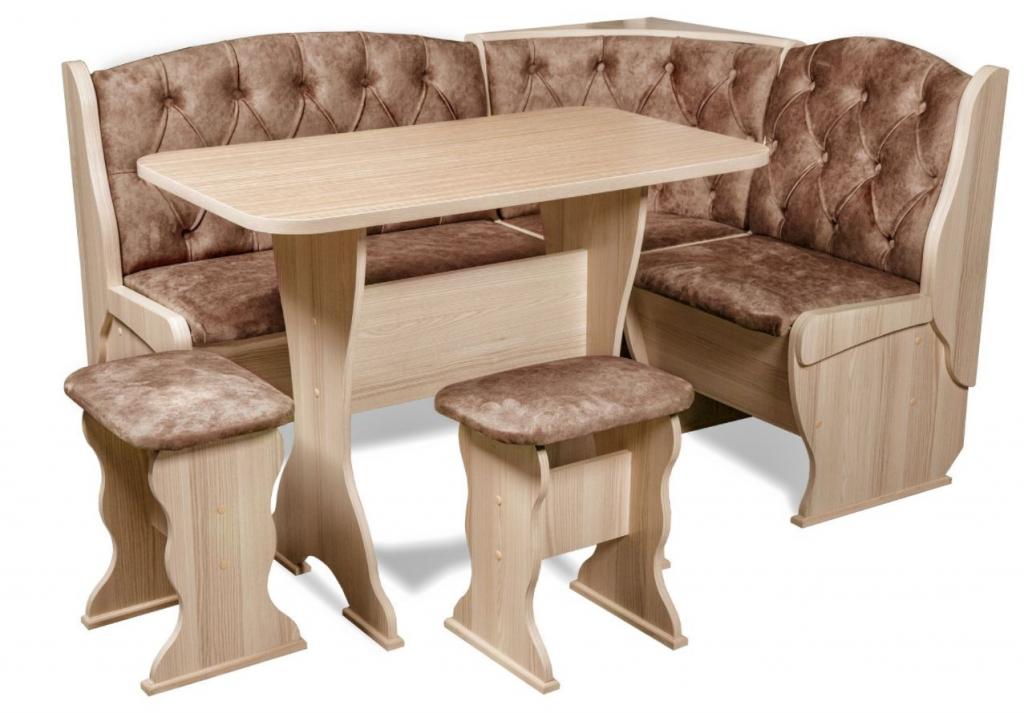 Описание: Набор мебели для кухни с классической красивой каретной стяжкой, включающий в себя угловую скамью, стол и два табурета. В угловой скамье под сиденьями расположены два ящика. Каркас ЛДСП. Покрытие верхней части столешницы стола - термостойкий пла