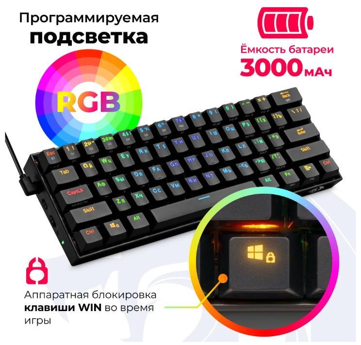 Позолоченный USB-коннектор - Позолоченное напыление обеспечивает лучшую проводимость, меньшее сопротивление и окисляемость Аппаратная блокировка клавиши WIN во время игры Программируемая RGB подсветка Технология Hot Swap Влагоустойчивая конструкция клавиатуры Распознает одновременное нажатие 87 клавиш Технология Double injection - Символы не сотрутся, так как клавиши отлиты из двух цветов пластика: черный для области кнопки и белый/прозрачный для символов