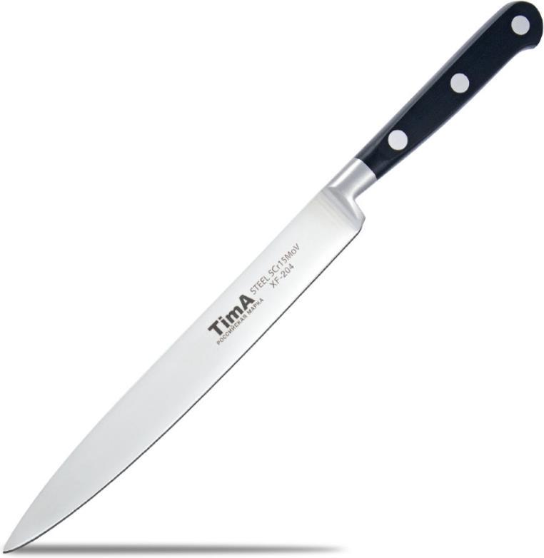 Материал: Молибден-ванадиевая сталь. Благодаря молибдену лезвие имеет нужную жесткость, а ванадию - металл не вступает в химические реакции с продуктами. Твердость лезвия по шкале Роквелла — 55 HRC. Ручка не скользит в руке и имеет удобную форму.