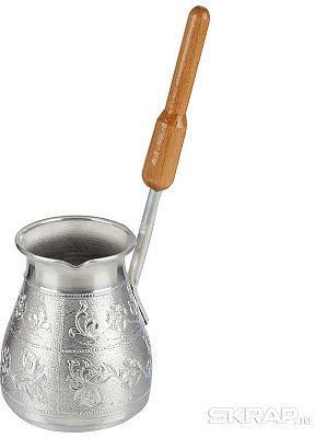 Алюминиевые турки изготавливаются из листового металла- сплав А5М. Состав : алюминий, бук; Объем: 420мл; Упаковка: п/э пакет Красивые, прочные и удобные изделия из алюминия органично впишутся в интерьер вашей кухни. Безопасность для человека обеспечиваем системой управления качеством и сертификацией продукции. При эксплуатации возможно потемнение поверхности вследствие окисления алюминия. Для удаления темного налета с алюминиевой кофеварки наливают воду и добавляют столовый уксус из пропорций 100 гр уксуса на 1 литр воды и подвергают кипячению. После кипячения раствор сливают, поверхность промывают с моющим средством; важно не мыть алюминиевую турочку в посудомоечной машине во избежание потемнения поверхности и появления серого налета;