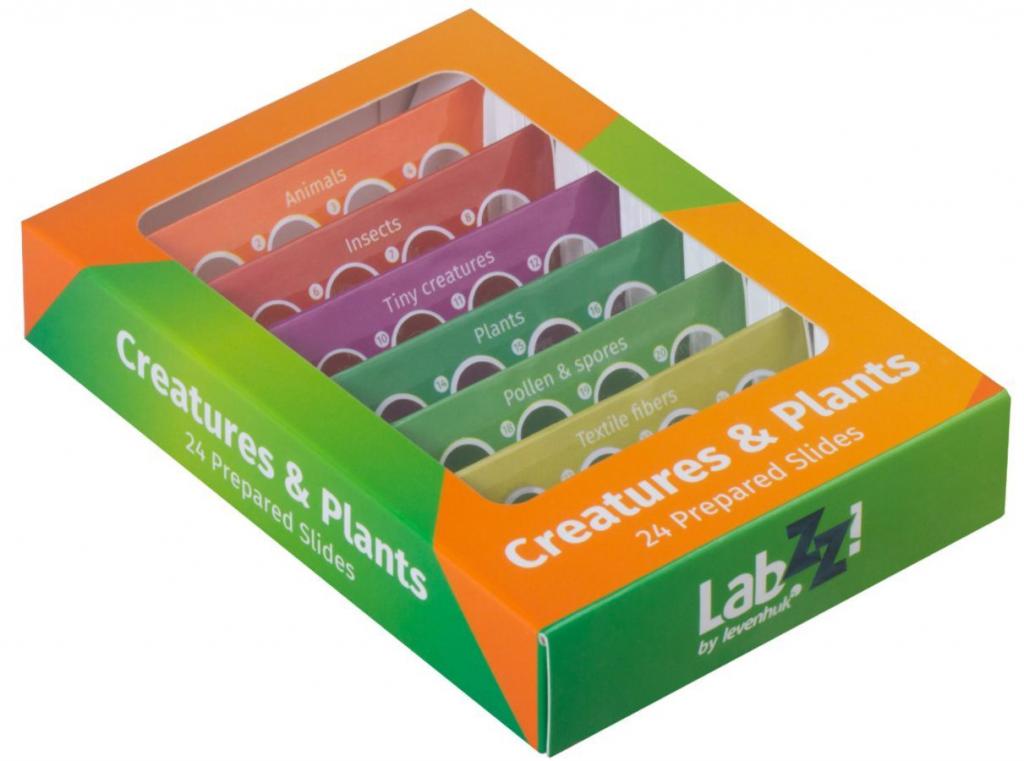 Набор микропрепаратов Levenhuk LabZZ CP24, существа и растения – это оригинально оформленные образцы для самостоятельных наблюдений, наглядные пособия по ботанике, зоологии и энтомологии. Всего в наборе 24 образца. Все микропрепараты подписаны и сгруппированы по темам: например, есть пластины «Животные», «Растения» и «Крошечные существа». Образцы оклеены цветной бумагой с круглыми прозрачными окошками. Весь набор упакован в фирменную коробку из прочного картона.