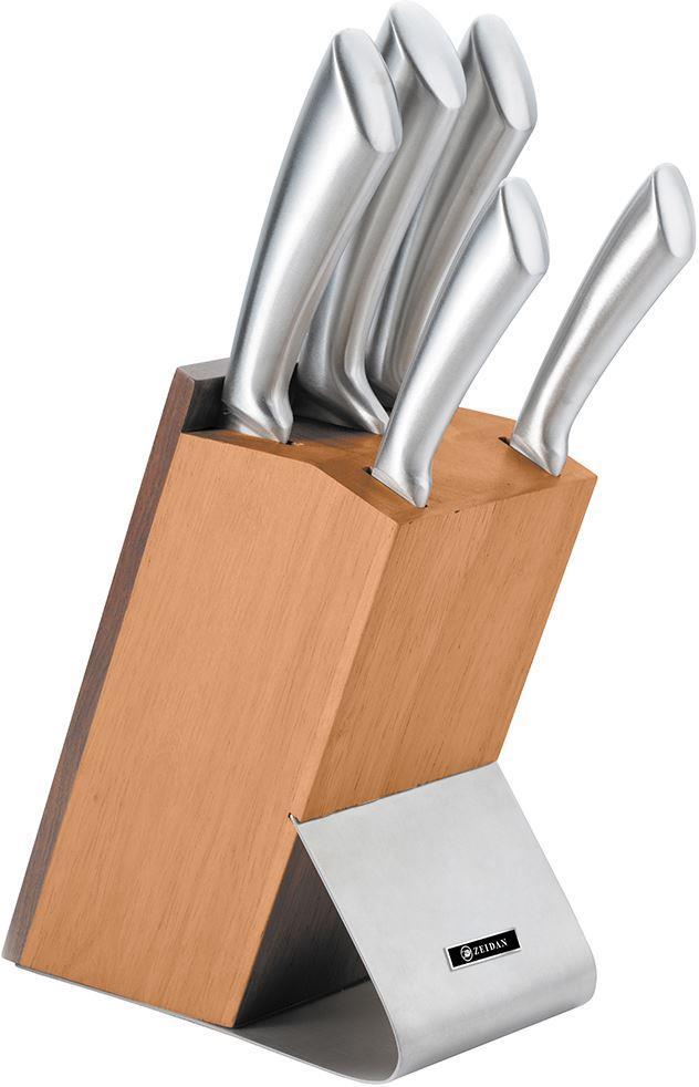 Набор ножей 6 предметов. Лезвие ножей из высококачественной нержавеющей стали: (нож поварской - 2,5mm/8", нож для хлеба - 2,5mm/8", нож разделочный -2,5mm/8", нож универсальный - 2,0mm/5", нож для овощей – 2,0mm/3,5", деревянная подставка для ножей.