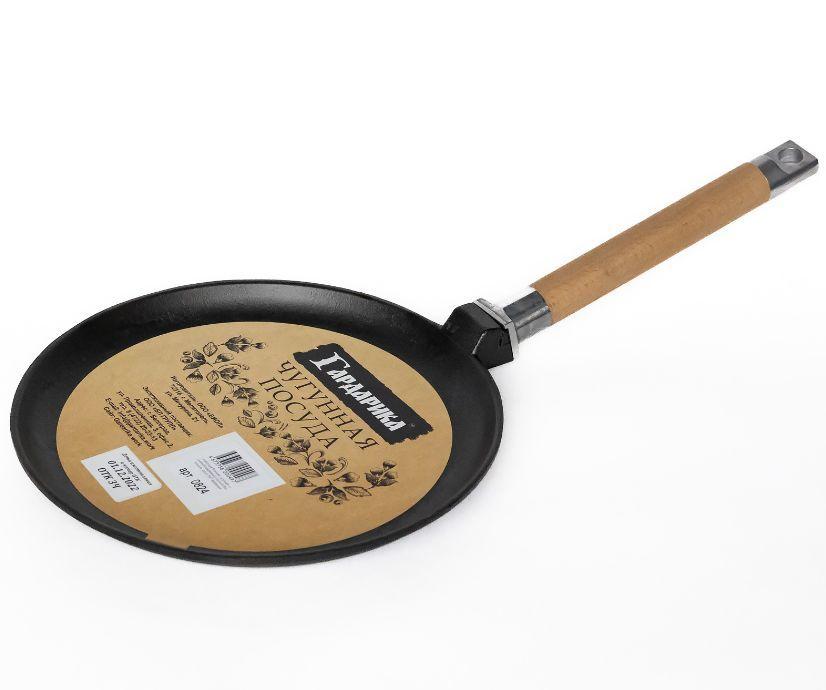 Сковорода блинная Готовить в чугунной сковороде — просто, полезно и невероятно вкусно. Она дарит прекрасные мгновения готовки и пищу, которая равномерно прожарена со всех сторон. Теплопроводность чугуна отлично подходит для приготовления тех блюд, где не нужны резкие перепады температуры. Чугунная посуда Гардарика предназначена для любых видов плит и любых варочных поверхностей, в том числе и на открытом огне. Характеристики: Диаметр: 24 см; Цвет: черный; Материал: чугун.