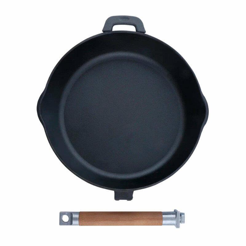 Сковорода Гардарика чугунная со съемной ручкой и двумя сливами 24 см. Материал посуды - чугун. Как показывает опыт, нет лучшего материала для изготовления посуды, нежели чугун. Во-первых, чугун считается экологически безопасным, чистым материалом. Во-вторых, он может быстро нагреваться до высоких температур и держать в себе тепло долгое время. Такая практичная посуда пробудет в эксплуатации ни один год. Чугунную посуду покупают для плит любых видов. Она удобна как для жарки, так и для тушения.