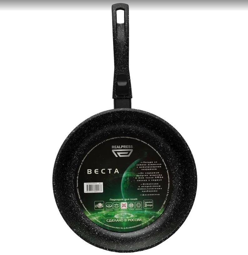 Сковорода REALPRESS 20 см серии ВЕСТА со съемной ручкой изготовлена в России из литого алюминия с многослойным антипригарным покрытием. Антипригарное покрытие наносится методом распыления под высоким давлением, что обеспечивает его жесткое сцепление с поверхностью металла. Это является гарантией длительного срока службы сковороды. Покрытие не содержит вредных веществ, в том числе ПФОА, свинца и кадмия, состоит из натуральных компонентов, не выделяет при эксплуатации посторонних веществ, устойчиво к непреднамеренному воздействию металлическими приборами. Сковорода имеет толстые стенки (около 3,5 мм) и утолщенное дно (около 6,5 мм). Сковороды RealPress идеально подходят для приготовления любых видов блюд: мясо, овощи, омлеты, блины, оладьи, гарниры, плов, в ней можно бережно тушить и готовить полезную и здоровую еду практически без использования масла! Благодаря равномерному нагреву и распределению тепла при их использовании можно не пережаривать пищу. Сковороды можно использовать на газовых, электрических, стеклокерамических плитах. Сковорода снабжена удобной съемной ручкой в цвет сковороды с покрытием soft touch. Цвет - черный гранит