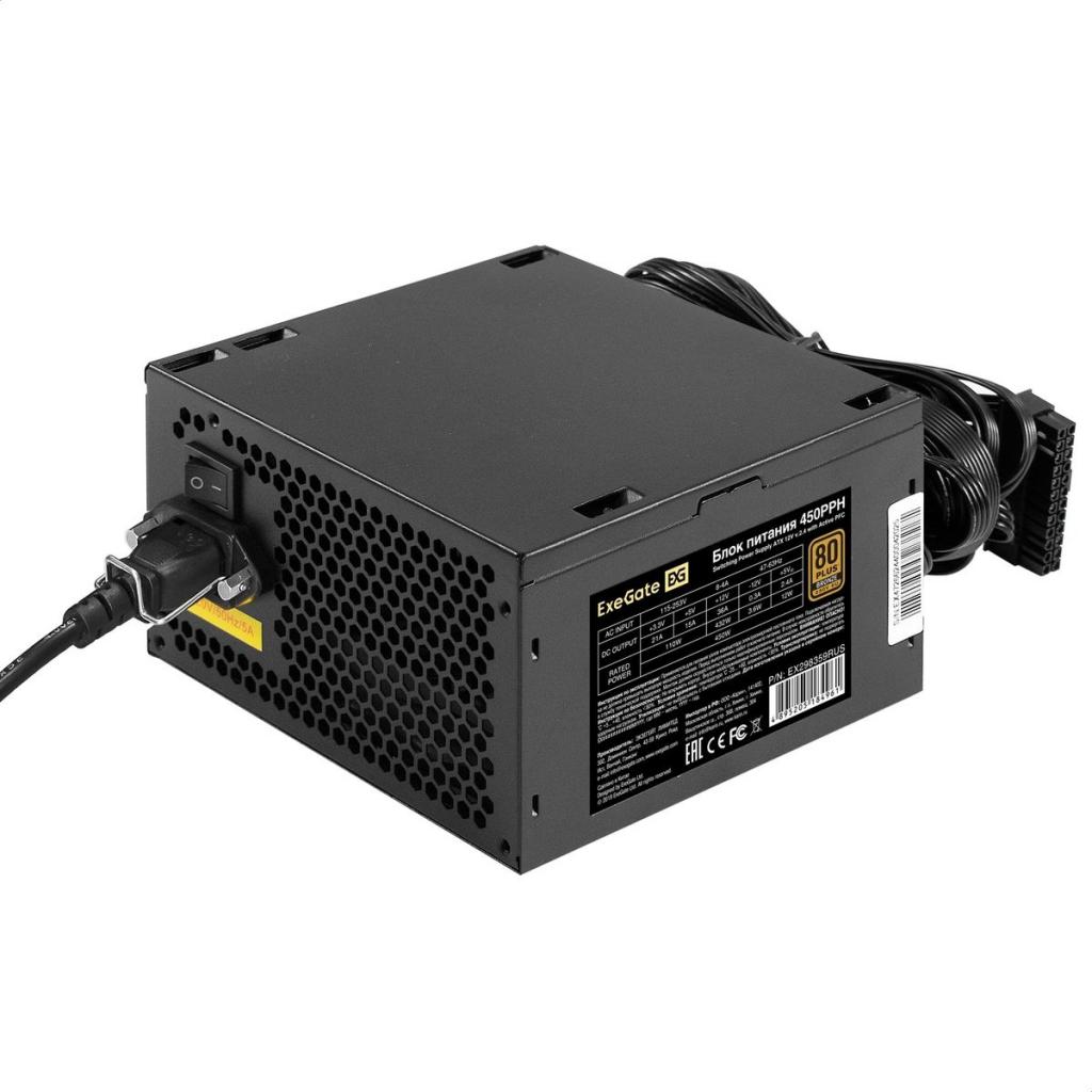 Блок питания 450W ExeGate 80 PLUS® Bronze 450PPH-S (ATX, APFC, SC, КПД 88% (80 PLUS Bronze), 12cm fan, 24pin, (4+4)pin, 2xPCI-E, 3xSATA, 3xIDE, кабель 220V 1,8м с защитой от выдергивания, black, Color Box)