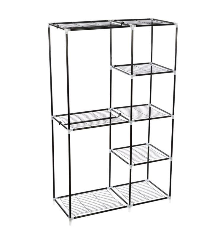 размер — 100*45*170см материал — металл+пластмасса 16*0.26 мм железо с покрытием+металлическая решетка — пластмасса упаковка — цветная коробка Стойка предназначена для удобного хранения одежды и организации пространства. 8 полок позволяют компактно разместить максимум вещей в условиях ограниченного пространства.