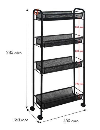 Материал: Лист ПВЛ, стальная труба 12 мм, пластиковые элементы Конструкция: Сборно-разборная Габариты (Д*Ш*В): изделия в собранном виде: 985х450х180 мм упаковка: 970х180х130 мм Вес Нетто: 3,2 кг Вес Брутто: 3,5 кг Объем: 0,0226 куб.м Отличительные особенности: - Четыре корзины - допустимая нагрузка до 10 кг на корзину - Пластиковые колёса - Пластиковый крючок для мелочей - Расстояние между корзинами 340 и 230 мм.