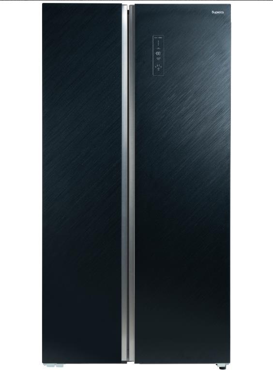 Холодильник Side-by-side с текстурированным черным стеклом • система Full No Frost • Dual Inverter: инверторные компрессор и вентилятор • дисплей на двери • система распределения воздушных потоков MultiFlow • класс энергоэффективности А++ • деодорирующий фильтр Nano Ag+ • габариты 178,5x91,3x67см • объем 541/343/198л