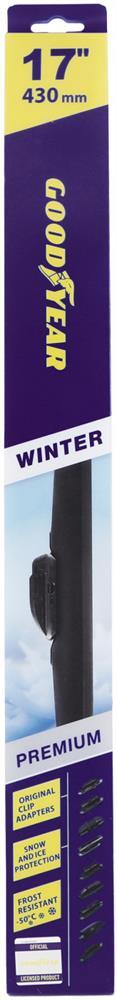 Зимняя щетка стеклоочистителя Goodyear «Winter Premium» с уникальной системой креплений адаптеров Original Clip Adapters позволяет использовать GOODYEAR WINTER PREMIUM на 99,8% всех моделей легковых автомобилей. В комплекте 9 адаптеров на 11 видов крепления: Hook, Side Pin, Push Button (19 mm), Pinch Tab, Bayonet, Narrow Push Button (17 mm), Guide Lock (DNTL1.1), Cap Lock (VATL5.1), Cover Lock (MBTL1.1), Bayonet ARM, AeroClip. Уникальная зимняя щетка стеклоочистителя великолепно очищает стекла автомобиля даже в условиях «мокрого» снега и наледи. Резиновый герметичный чехол с проклеенными краями защищает каркас щетки от обледенения. Менее подвержена коррозии и имеет увеличенный ресурс. Клиновидная форма лезвия с высоким профилем, позволяет получить качественную очистку лобового стекла. Резиновое лезвие Triple A ( класса ААА) гарантирует качественную очистку стекла при любых погодных условиях. Идеальными для эксплуатации зимних щеток являются температуры -50…+5° С.