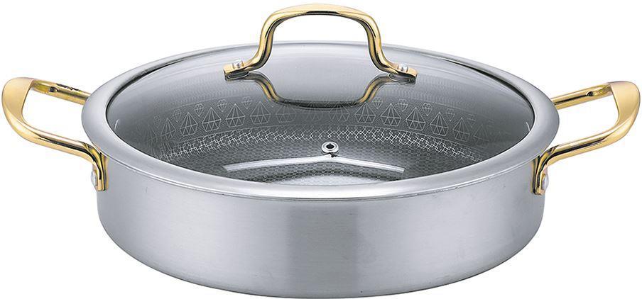 Жаровня с крышкой Z-90256 d24x6 см Allegro, Жаровня с крышкой d24x6 см, высококачественная нержавеющая сталь, 3-Х СЛОЙНЫЙ КОРПУС, ИНДУКЦИОННОЕ ДНО, ИННОВАЦИОННОЕ АНТИПРИГАРНОЕ ПОКРЫТИЕ С ЗАЩИТНОЙ СЕТКОЙ, крышка - стекло с металлическим кантом, металлические ручки «под золото», подарочная упаковка с пластиковой ручкой.