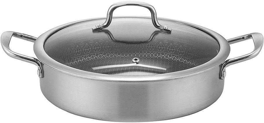 Жаровня с крышкой d24x6 см, высококачественная нержавеющая сталь, 3-Х СЛОЙНЫЙ КОРПУС, ИНДУКЦИОННОЕ ДНО, ИННОВАЦИОННОЕ АНТИПРИГАРНОЕ ПОКРЫТИЕ С ЗАЩИТНОЙ СЕТКОЙ, крышка - стекло с металлическим кантом, металлические ручки,