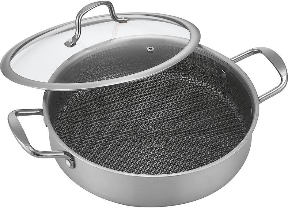 Жаровня с крышкой d26x7 см, высококачественная нержавеющая сталь, 3-Х СЛОЙНЫЙ КОРПУС, ИНДУКЦИОННОЕ ДНО, ИННОВАЦИОННОЕ АНТИПРИГАРНОЕ ПОКРЫТИЕ С ЗАЩИТНОЙ СЕТКОЙ, крышка - стекло с металлическим кантом, металлические ручки,