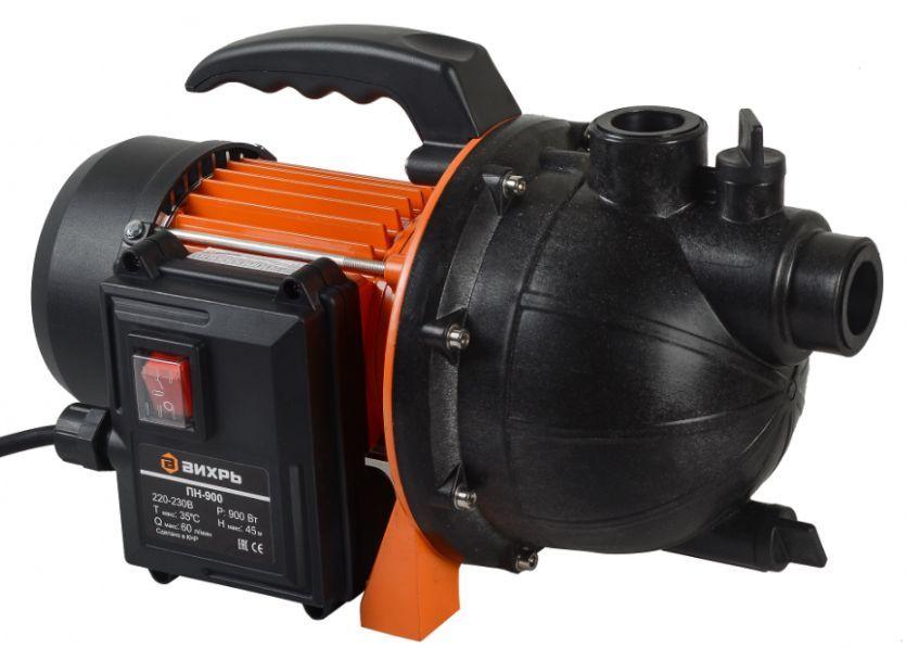 Поверхностный насос ВИХРЬ ПН-900. Мощность, Вт – 900; Тип насоса – центробежный; Максимальный напор, м - 45; Максимальная подача, л/мин – 60; Материал корпуса насоса – пластик;
