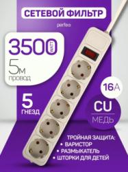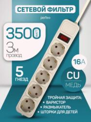 PERFEO (PF_E1642) "POWER-S", 5,0м, 3 розетки 10А, 2USB, 2500 Вт, двойная защита, серый 357