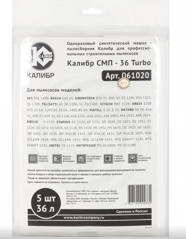 Одноразовый синтетический мешок - пылесборник Калибр СМП-36 Turbo для профессиональных строительных пылесосов моделей: AEG RSE 1400; BOSCH GAS 25; EIBENSTOCK DSS 25, DSS 35, SS 1200, DSS 1225, SS 1200; FELISATTI AS 20/1200, VC 25/1400; HITACHI RNT 1225; KRESS 1200 NTS 20 EA, 1200 RS 32 EA, 1400 RS EA; MAFELL S 25, S 35; METABO AS 20, ASA 32, ASR 25, ASR 35, AS 1200, ASA 1201, ASA 1202, ASA 2002, ASA 2025, ASR 2025; RIDGID V-1225; STARMIX AS 1220, AS 1232, GS 1020, GS 1022, GS 1032, GS 1220, GS 1232, GS 1435, GS 1120, HS 1420, HS 1432, HS 1635, ISC 1425, ISC 1625, ISP 1435, ISP 1035, ISP IPULSE 1435, ISP IPULSE 1635, ISP IPULSE 1035, NSG UCLEAN 1420, NSG UCLEAN 1432, NSG UCLEAN 1435, NTS ESWIFT 1220, NTS ESWIFT 1232; UNITEC CS 1225; ИНТЕРСКОЛ ПУ-20/1000; ПУ-32/1200. Мешок крепится на патрубок пылеотсоса и предназначен для фильтрования выходящего из пылесоса потока воздуха и сбора строительной пыли и мусора в процессе работы пылесоса.