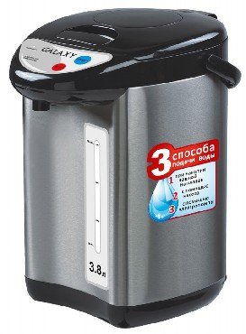 Мощность в режиме кипячения 900Вт. Объем 3,8л. 3 способа подачи воды: при нажатии чашкой на клапан, с помощью насоса, с помощью электропомпы. Функция повторного кипячения. Колба из нерж. стали. Ручка для переноски.