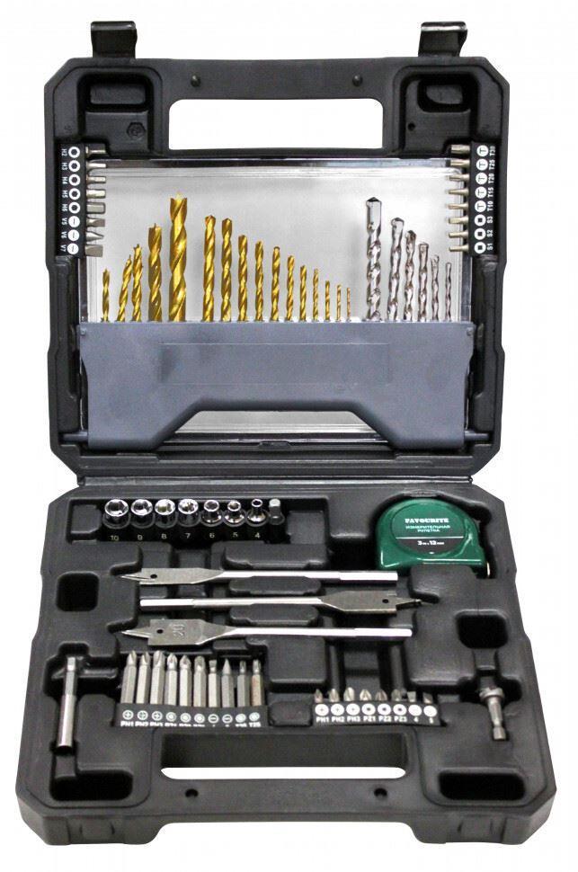 Набор инструментов FAV 70 SETS, 70 предметов: 11 сверл по металлу (1.5/2/2.5/3/3.5/4/4.5/5/5.5/6/6.5), 6 сверл по бетону (4/5/6/7/8/10), 5 свёрл по дереву (4/5/6/8/10), 3 сверла перовых (12/16/20), головки торцевые 1/4" (4/5/6/7/8/9/10)